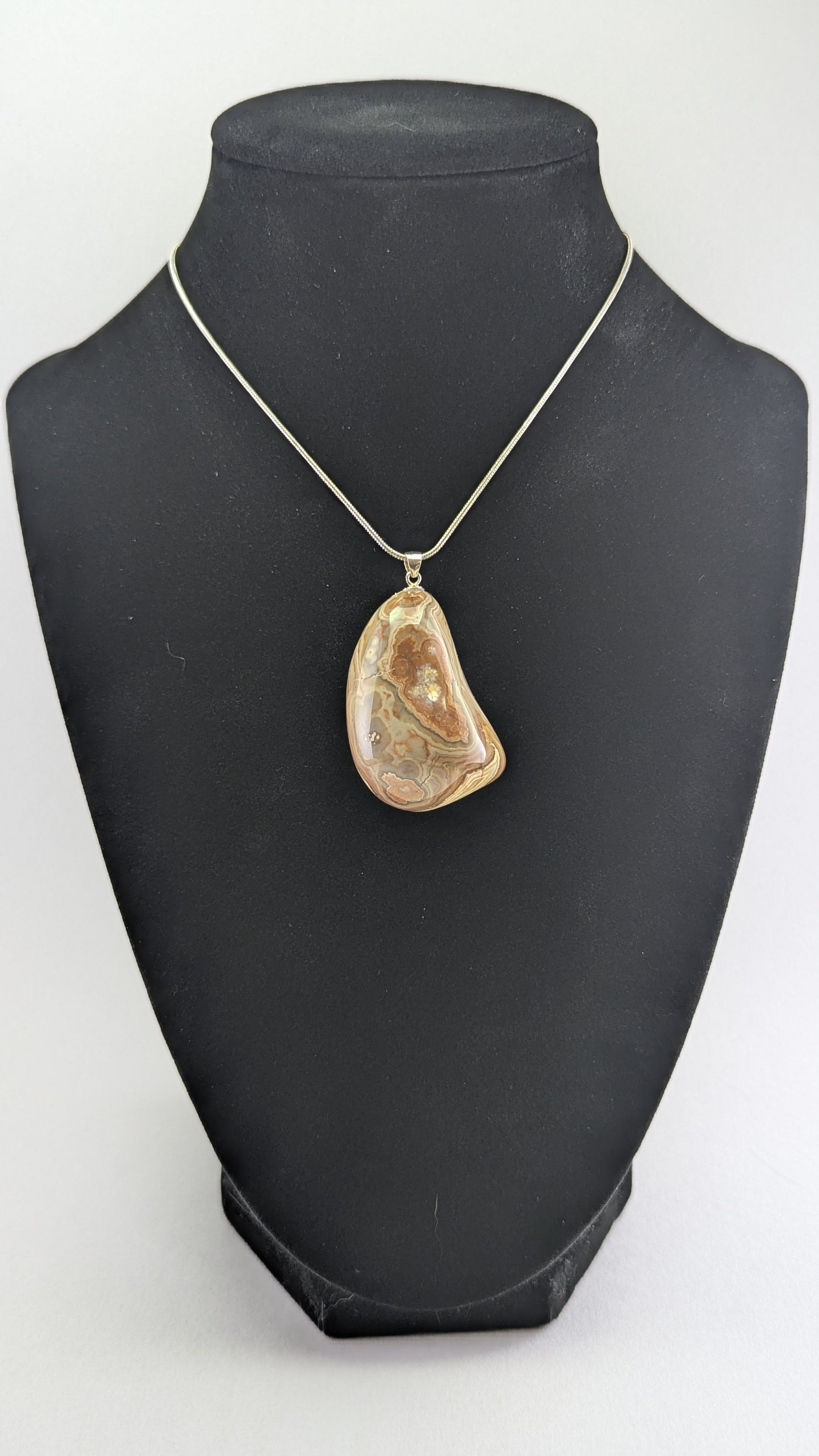 An exquisite reversible Bahia Agate from Brazil that is as intriguing from the back as it is from the front. Mounted to a 925 fine silver bail and strung on a 20" silver plated snake chain.
