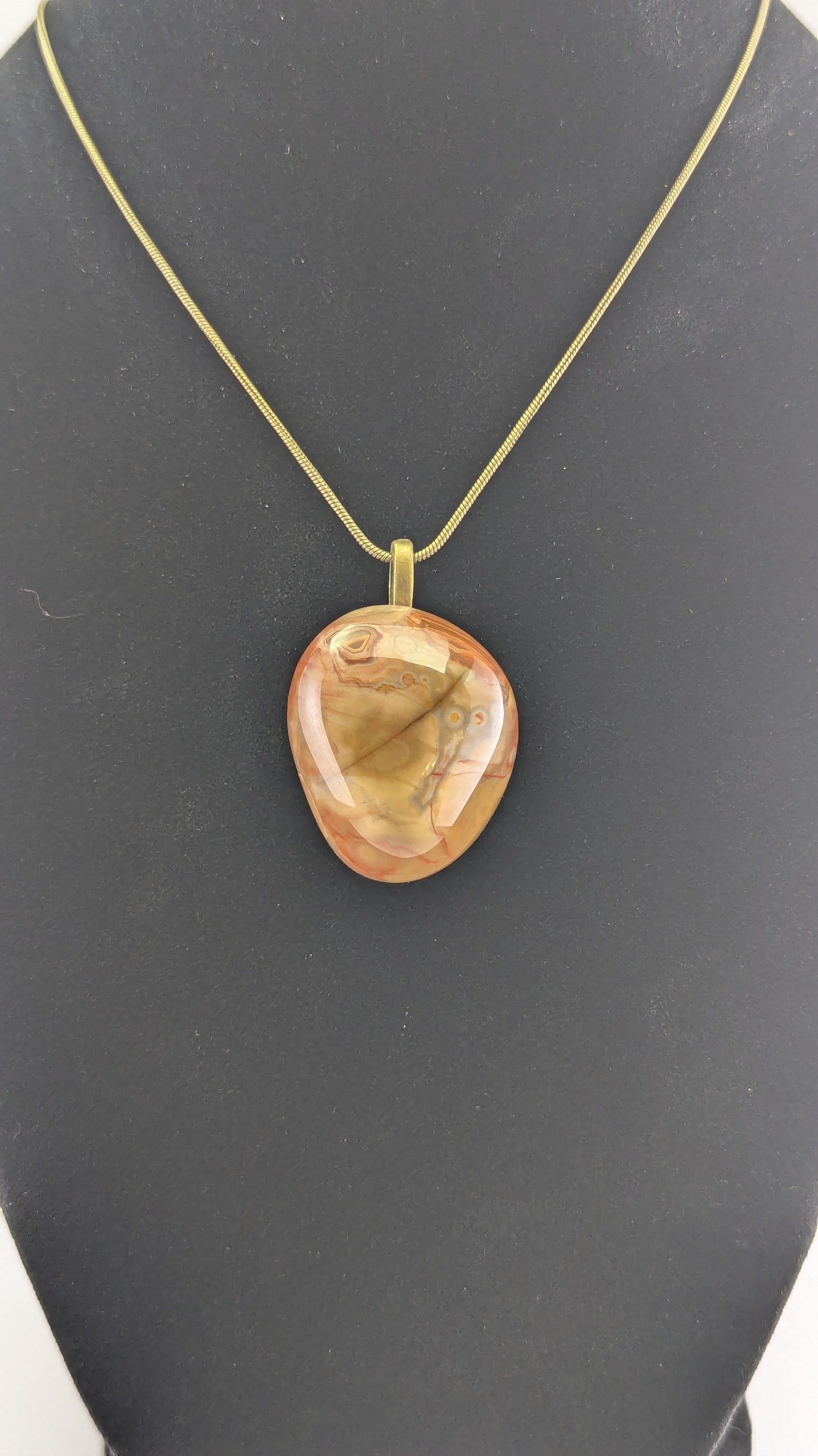 An interesting Bahia Agate from Brazil with depth and texture under a glassy surface. Mounted to an antique bronze plated bail and strung on a 20" bronze plated snake chain.
