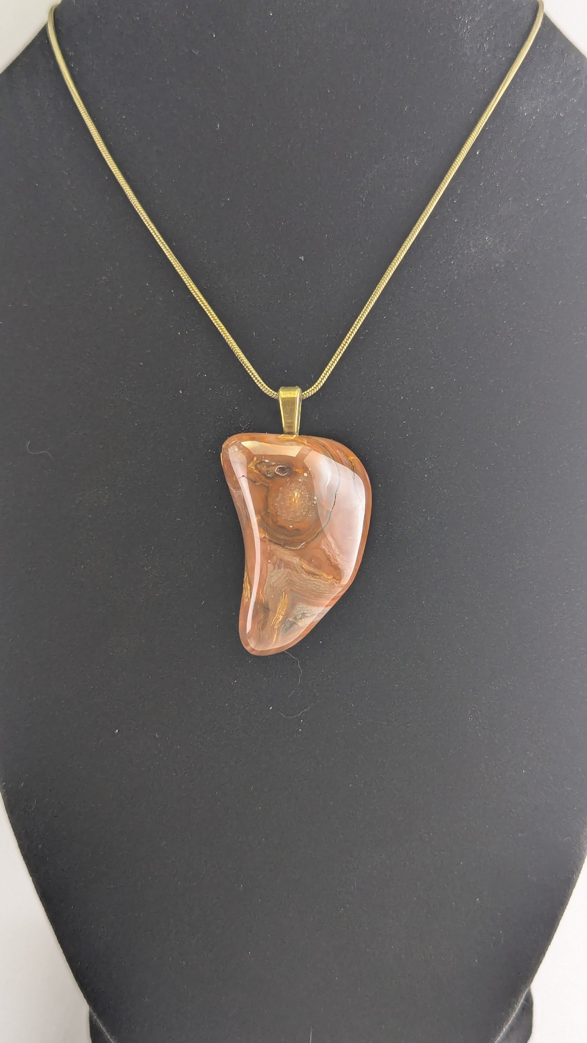A bold Bahia Agate with eyes, swirls and intricate layer lines. Mounted to an antique bronze plated bail and strung on a 20" antique bronze plated snake chain.