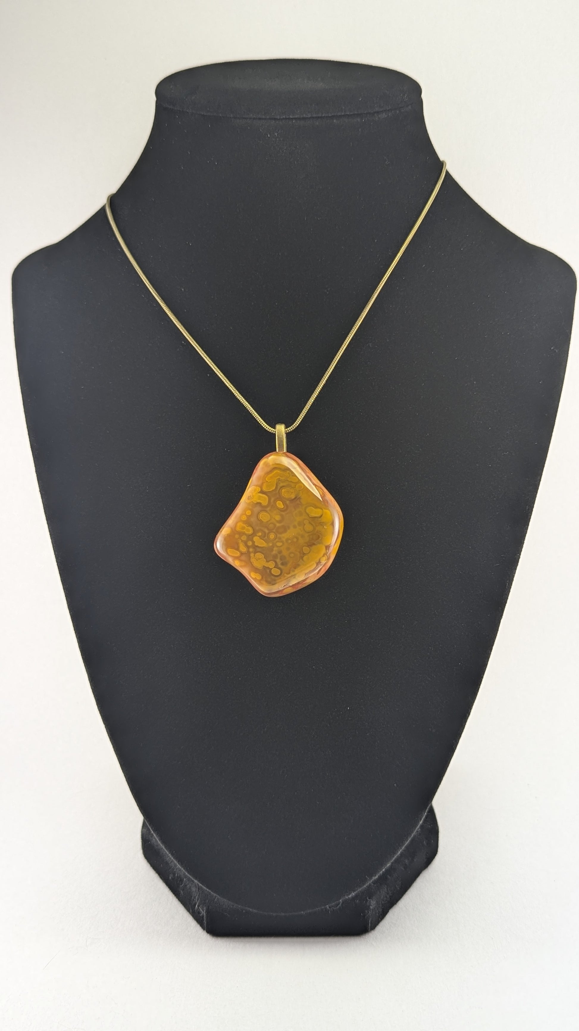 This Bahia Agate has interesting textural details. Mounted to an antique bronze plated bail and strung on a 20" antique bronze plated snake chain.