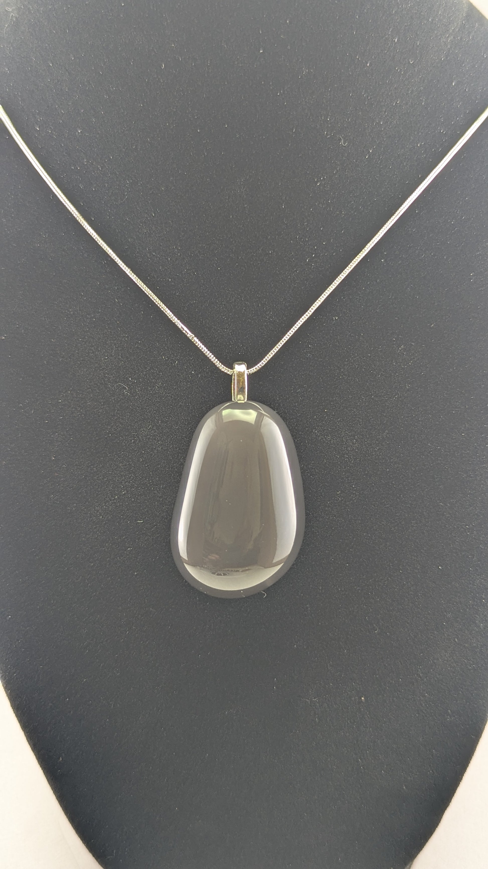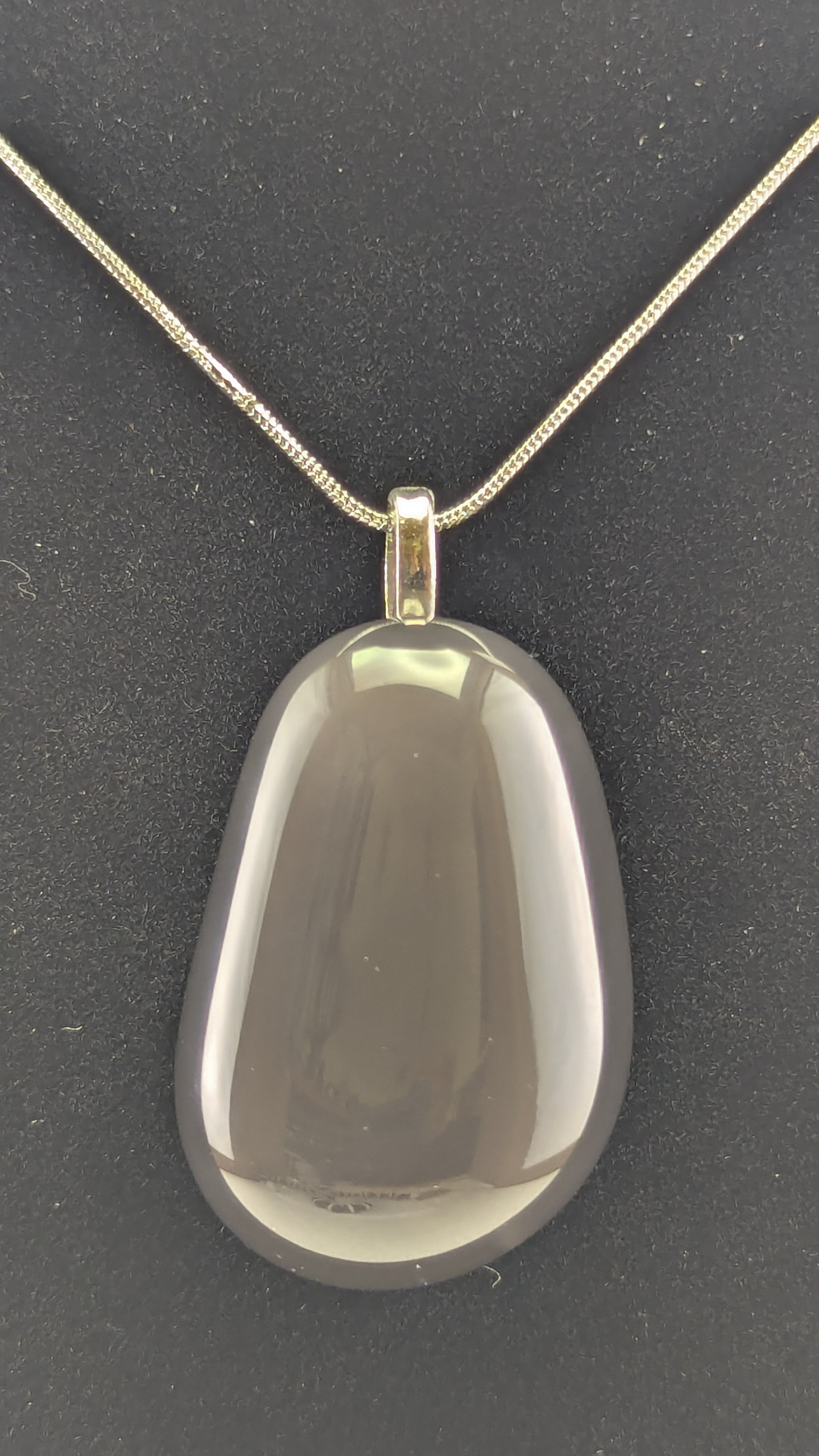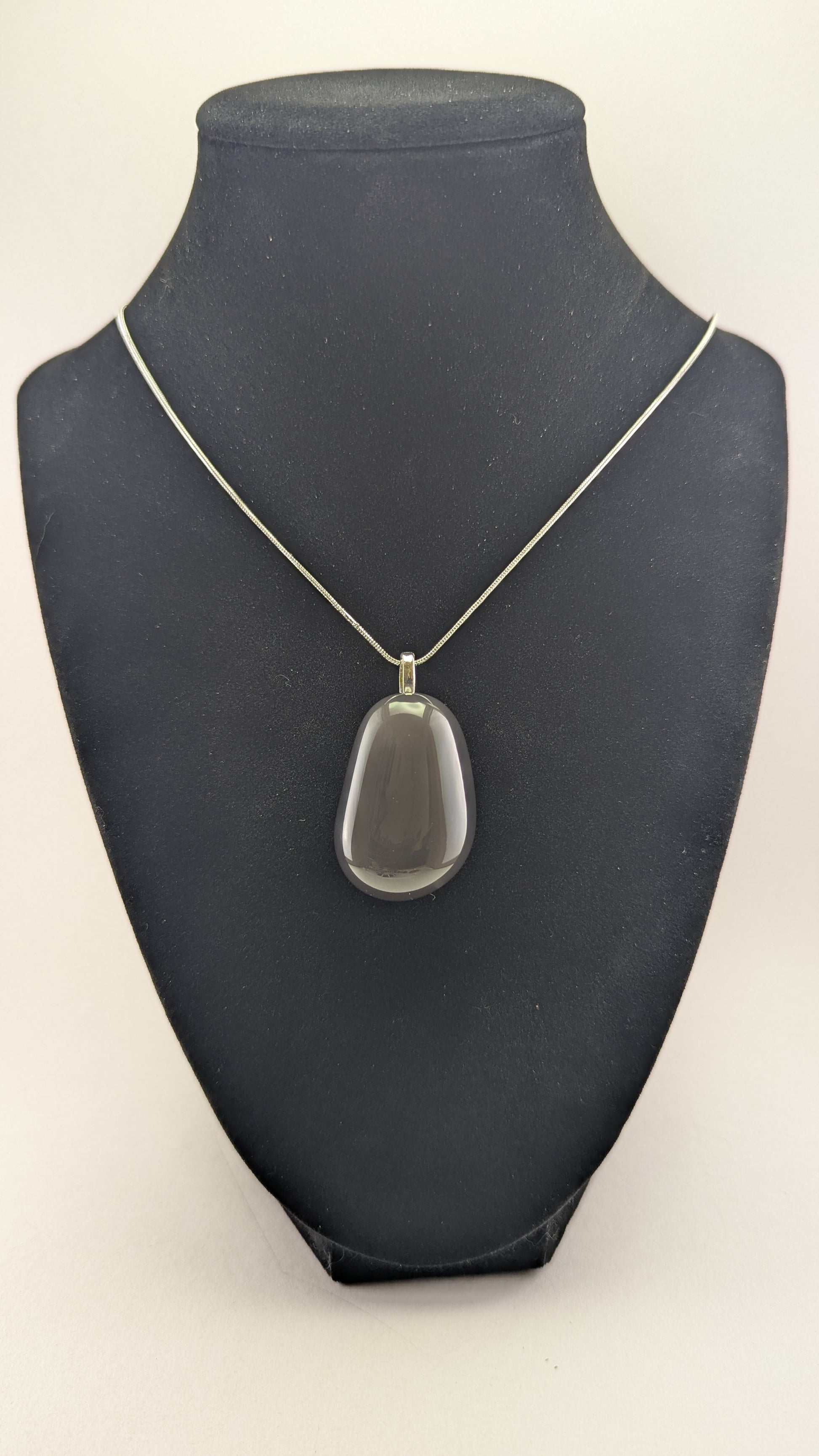 A striking, nearly black tumbled chalcedony stone. Mounted to a silver plated bail and strung on a 20" silver plated snake chain.