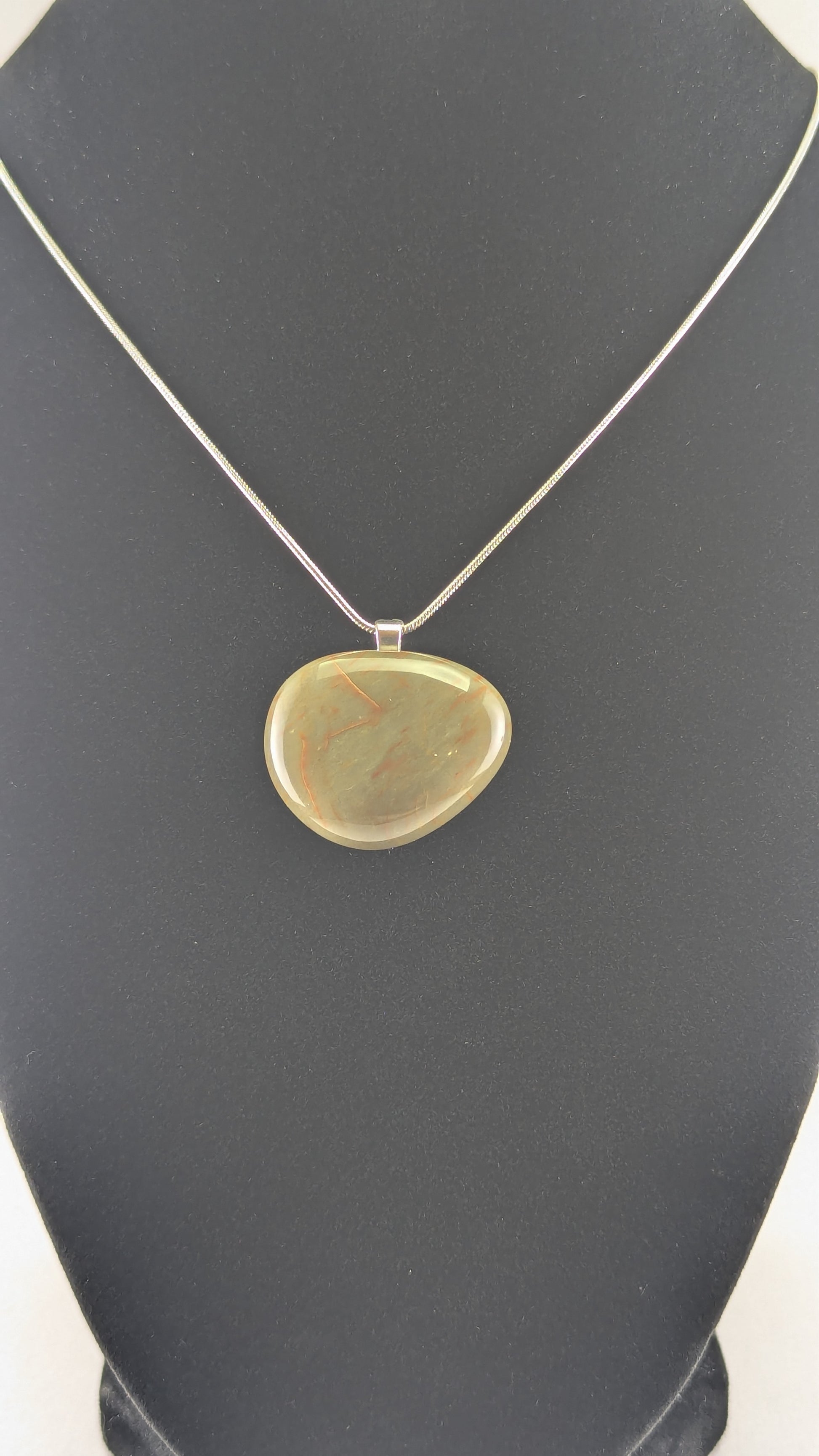 A beautiful bloodstone chalcedony collected from the beaches of Northern California. Bloodstone is chalcedony with streaks of red Jasper, giving it it's unusual name. Mounted to a silver plated bail and strung on a 20" silver plated snake chain.