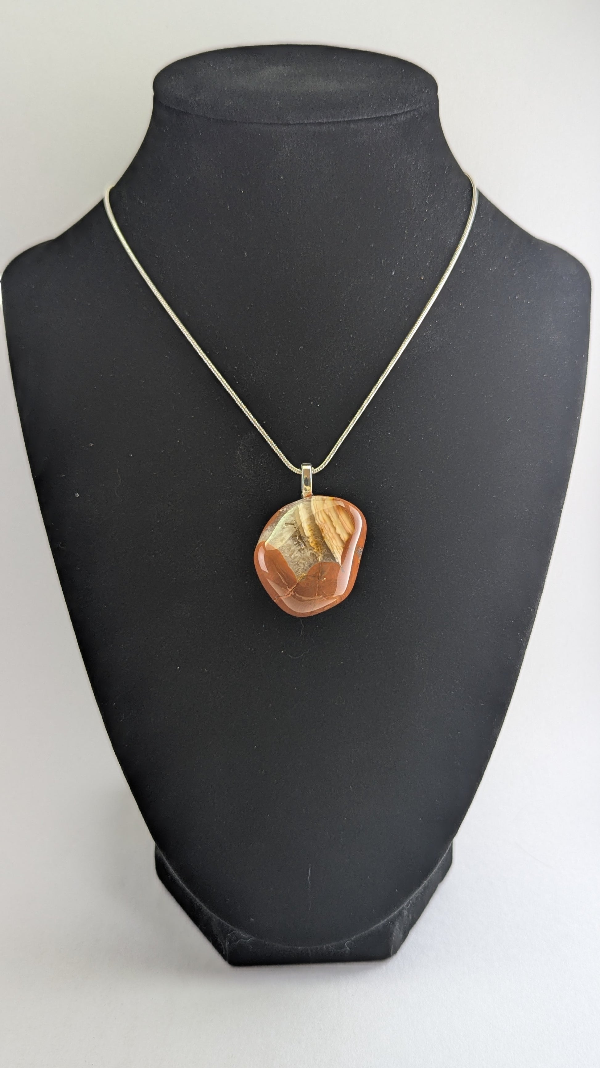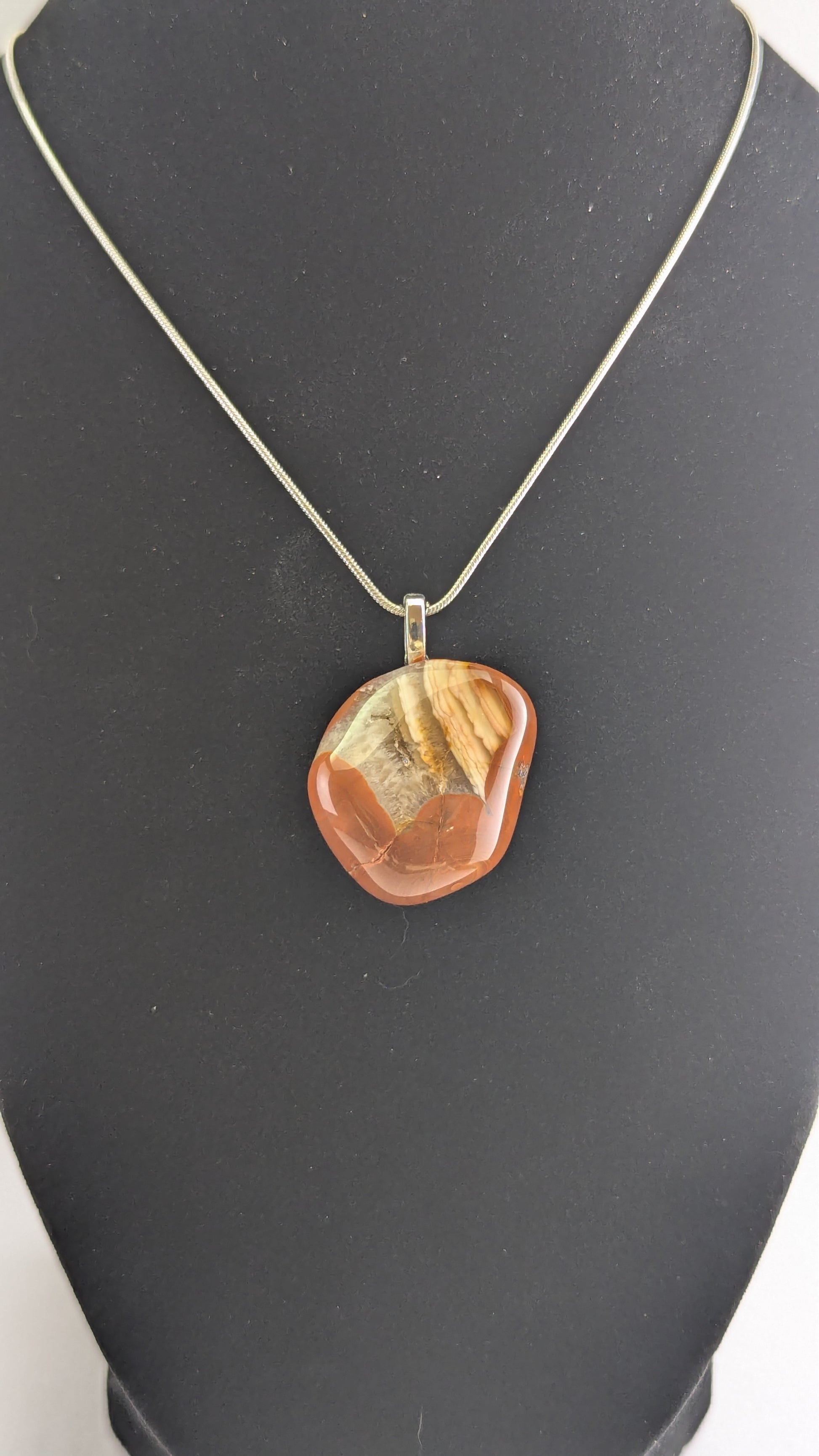 A super interesting Bahia Agate with a druzy quartz inclusion and dramatic layer lines. A glassy carnelian crust encapsulates the beauty within. Mounted to a silver plated bail and strung on a 20" silver plated snake chain.
