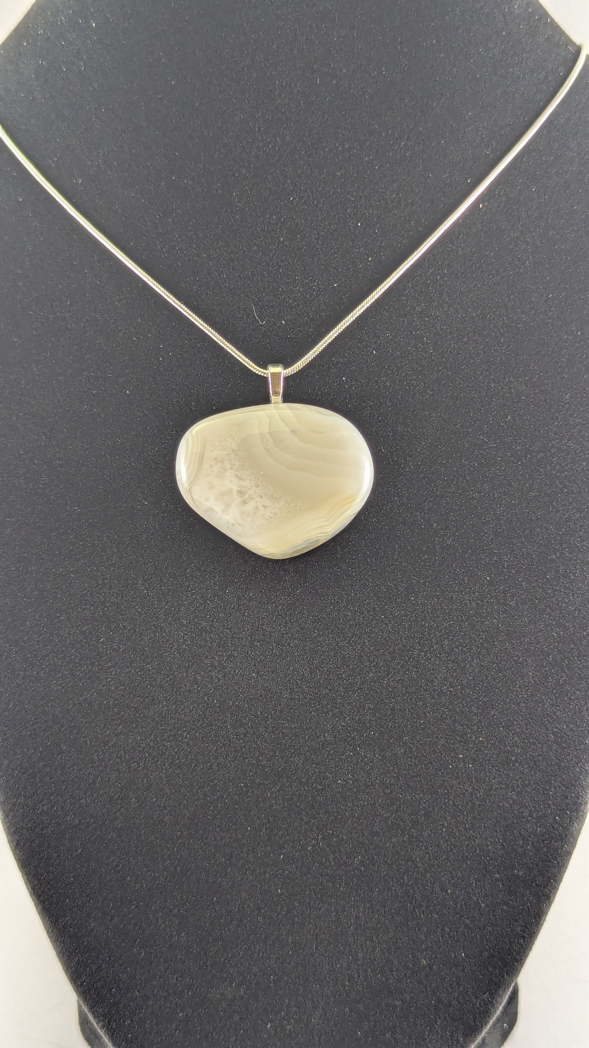A beautiful milky agate that showcases intricate detail. Mounted to a silver plated bail and strung on a 20" silver plated snake chain.
