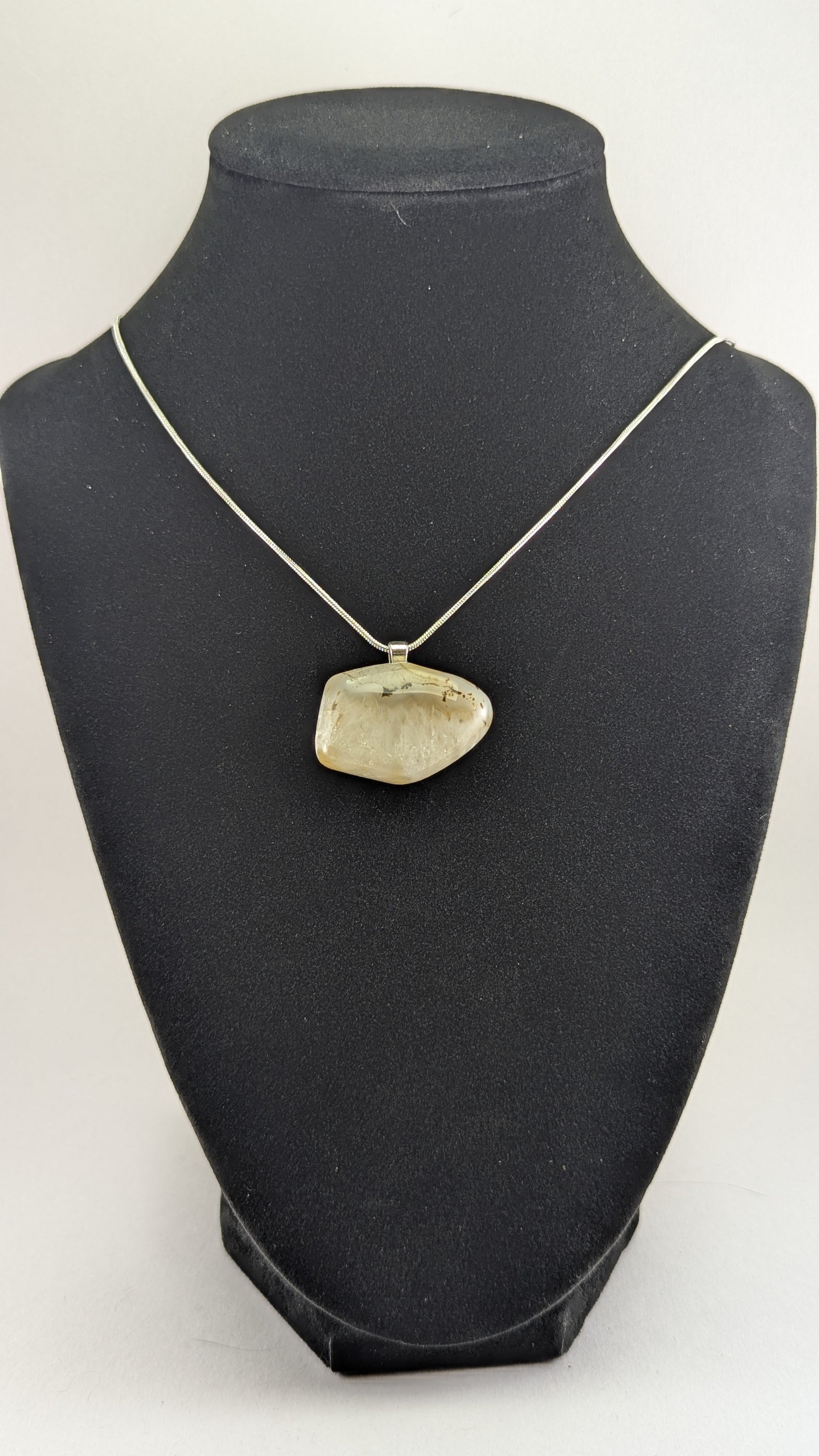 A unique cloudy Agate with quartz inclusions and grey banding. Mounted to a silver plated bail and strung on a 20" silver plated snake chain.