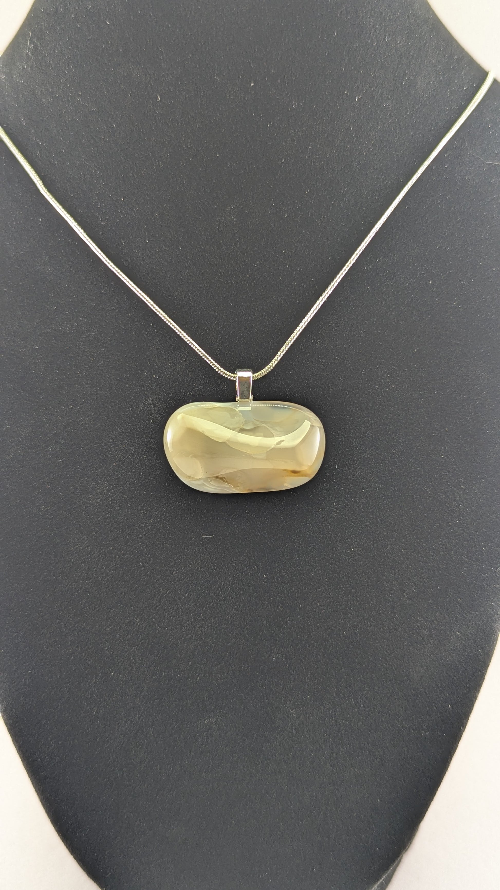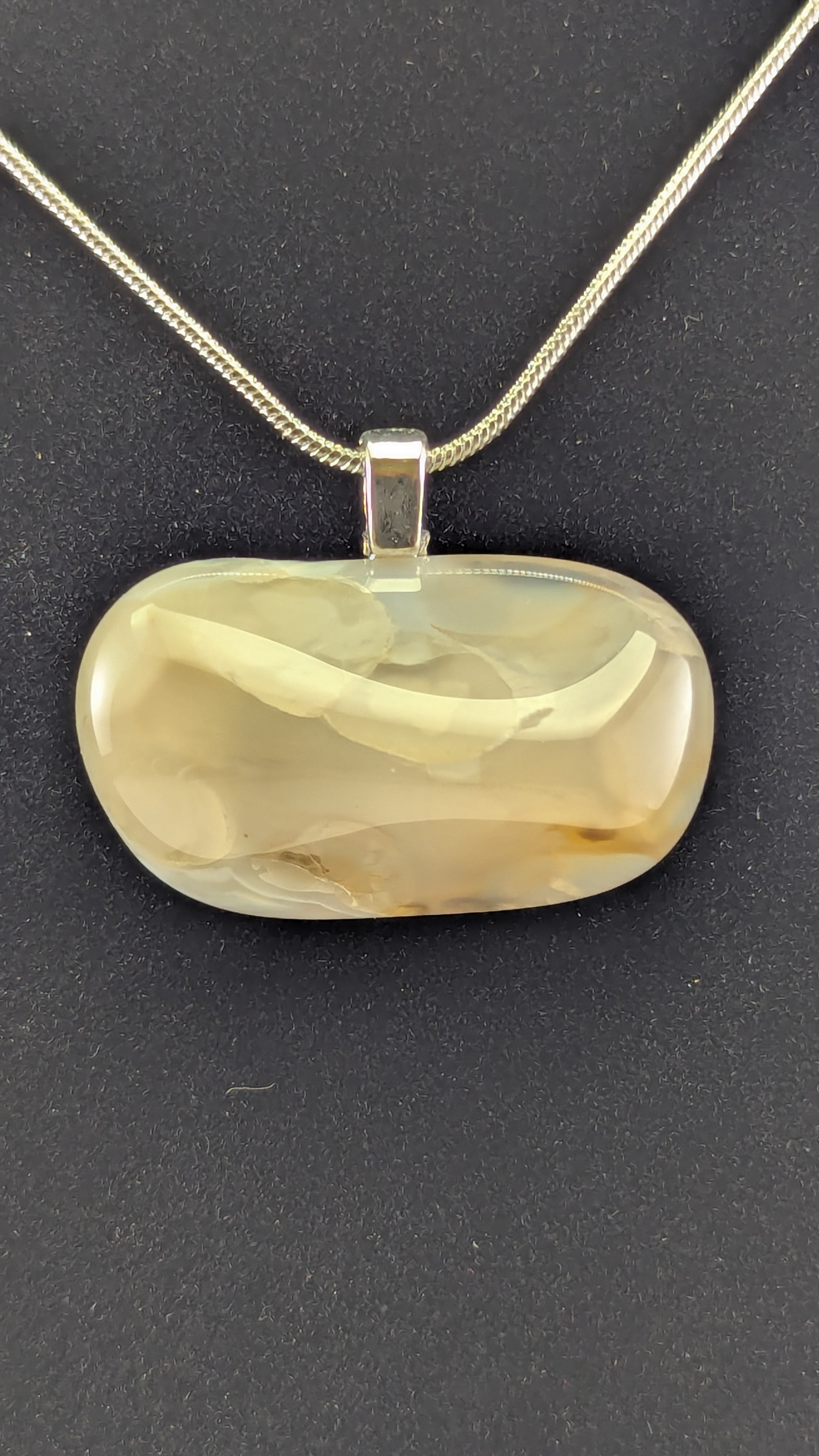 Cloudy Agate with inclusions and internal fracturing. Mounted to a silver plated bail and strung on a 20" silver plated snake chain.