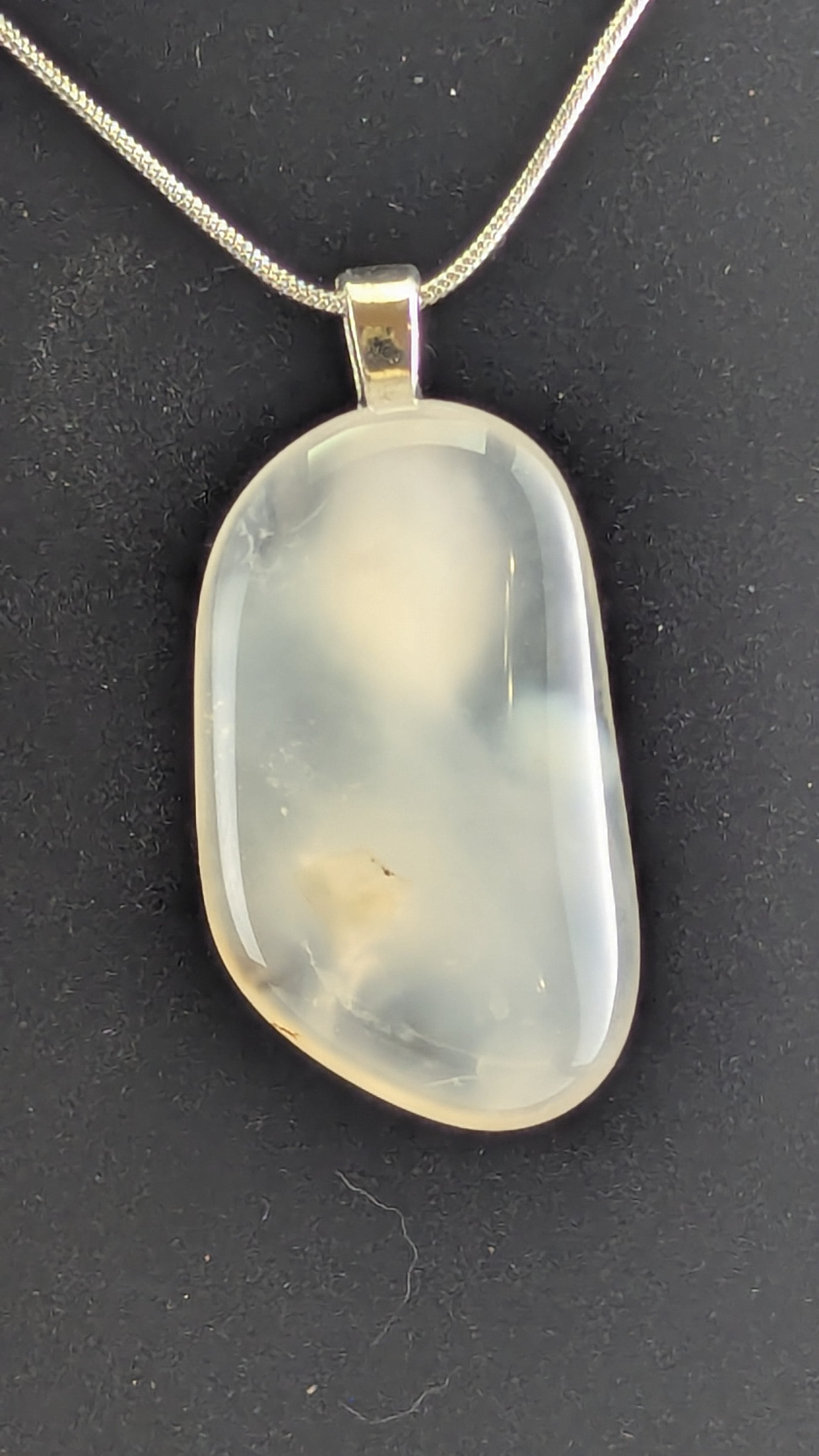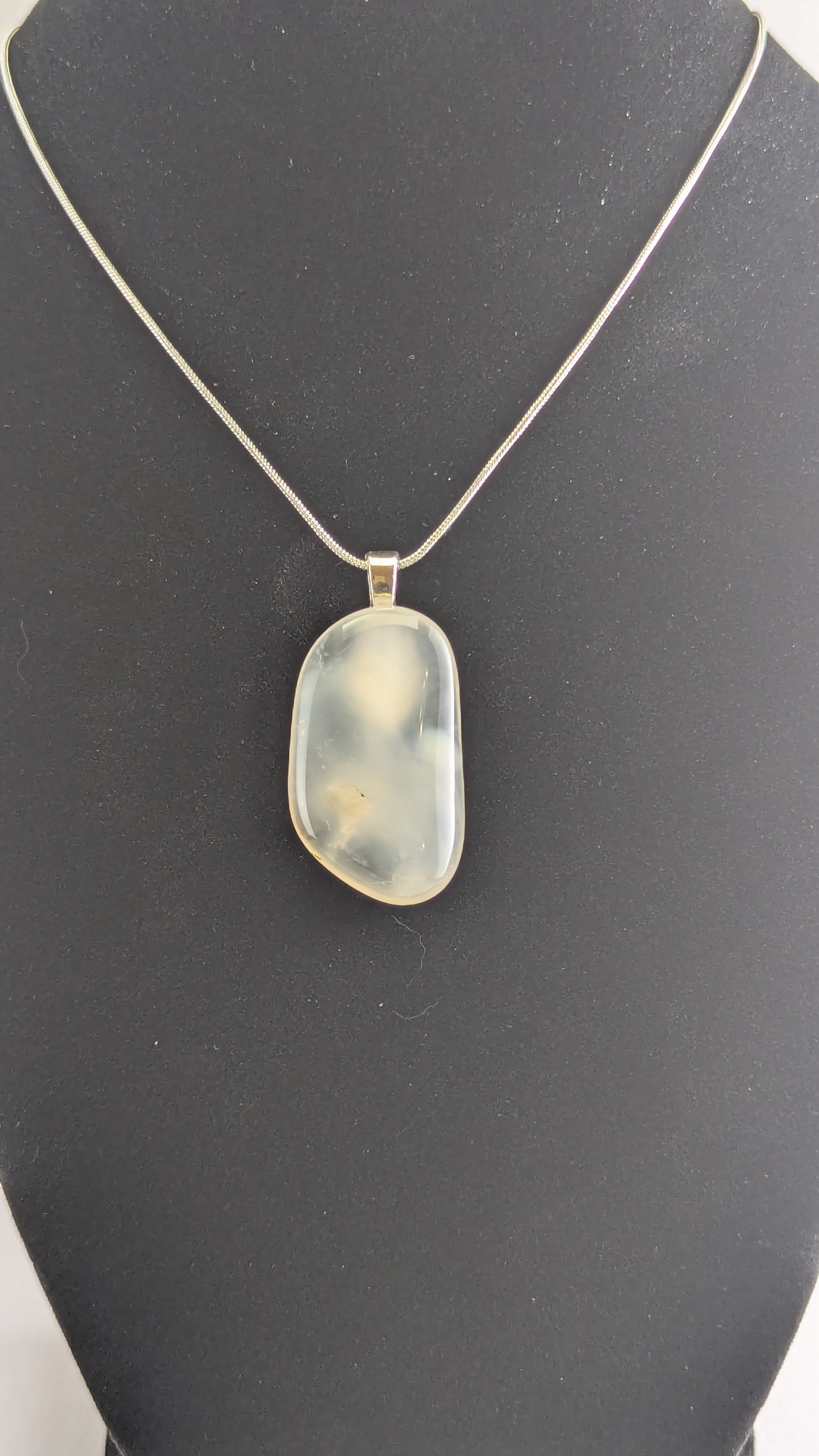 A translucent quartz with cloudy inclusions. Mounted to a silver plated bail and strung on a 20" silver plated snake chain.