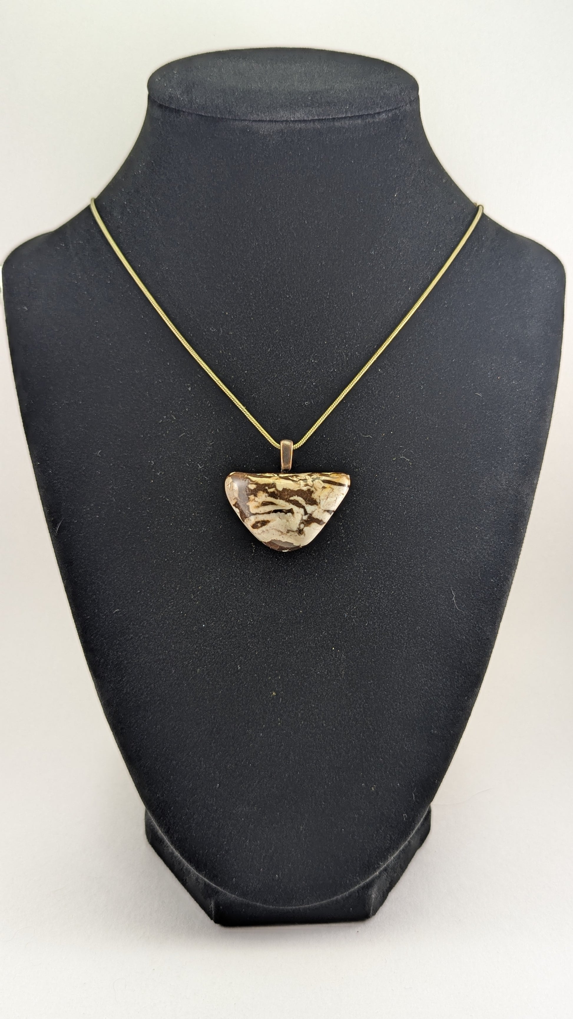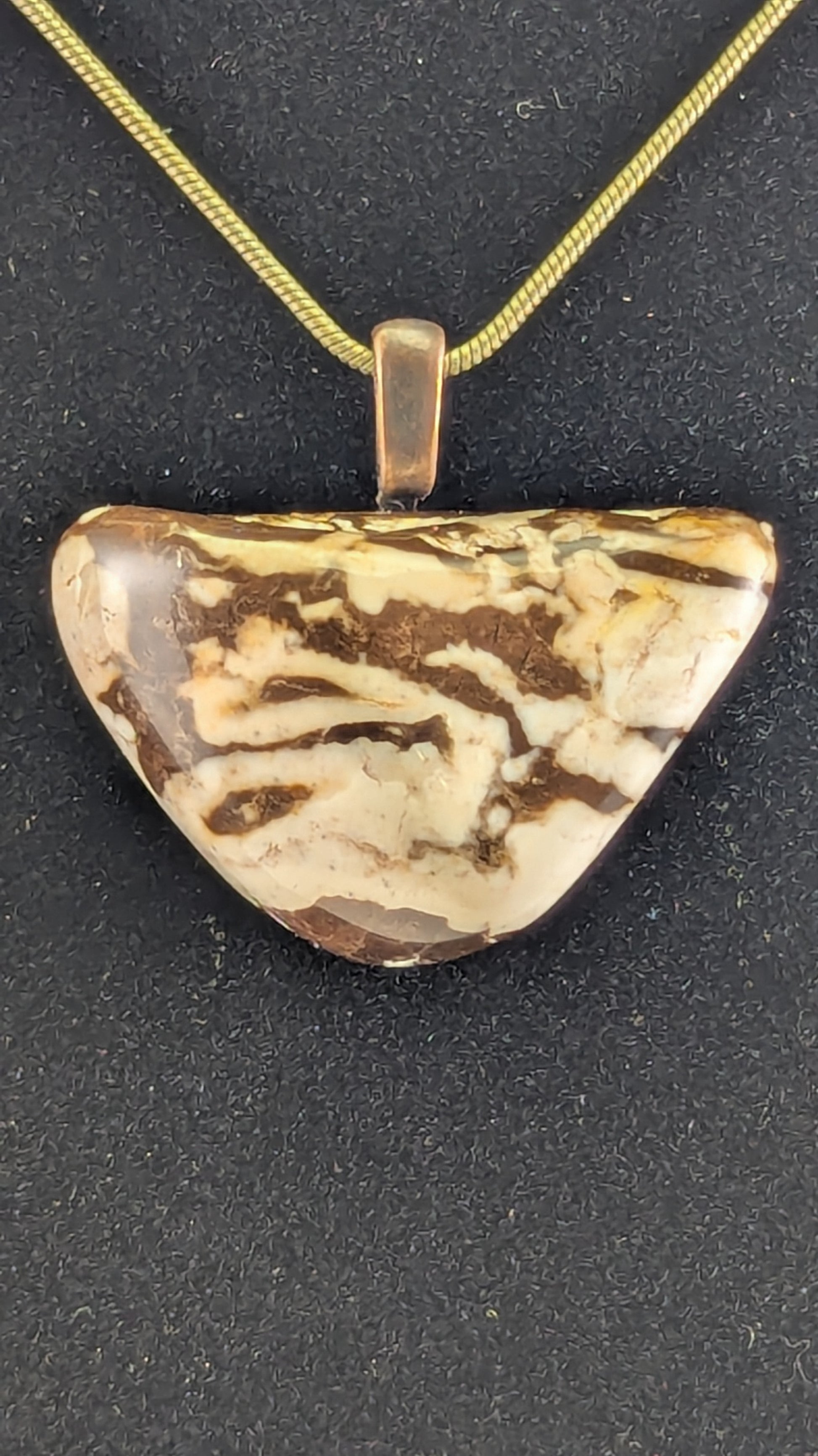 This zebra jasper exhibits the exquisite striping that this stone is famous for. Mounted to an antique bronze plated bail and strung on a 20" antique bronze plated snake chain.